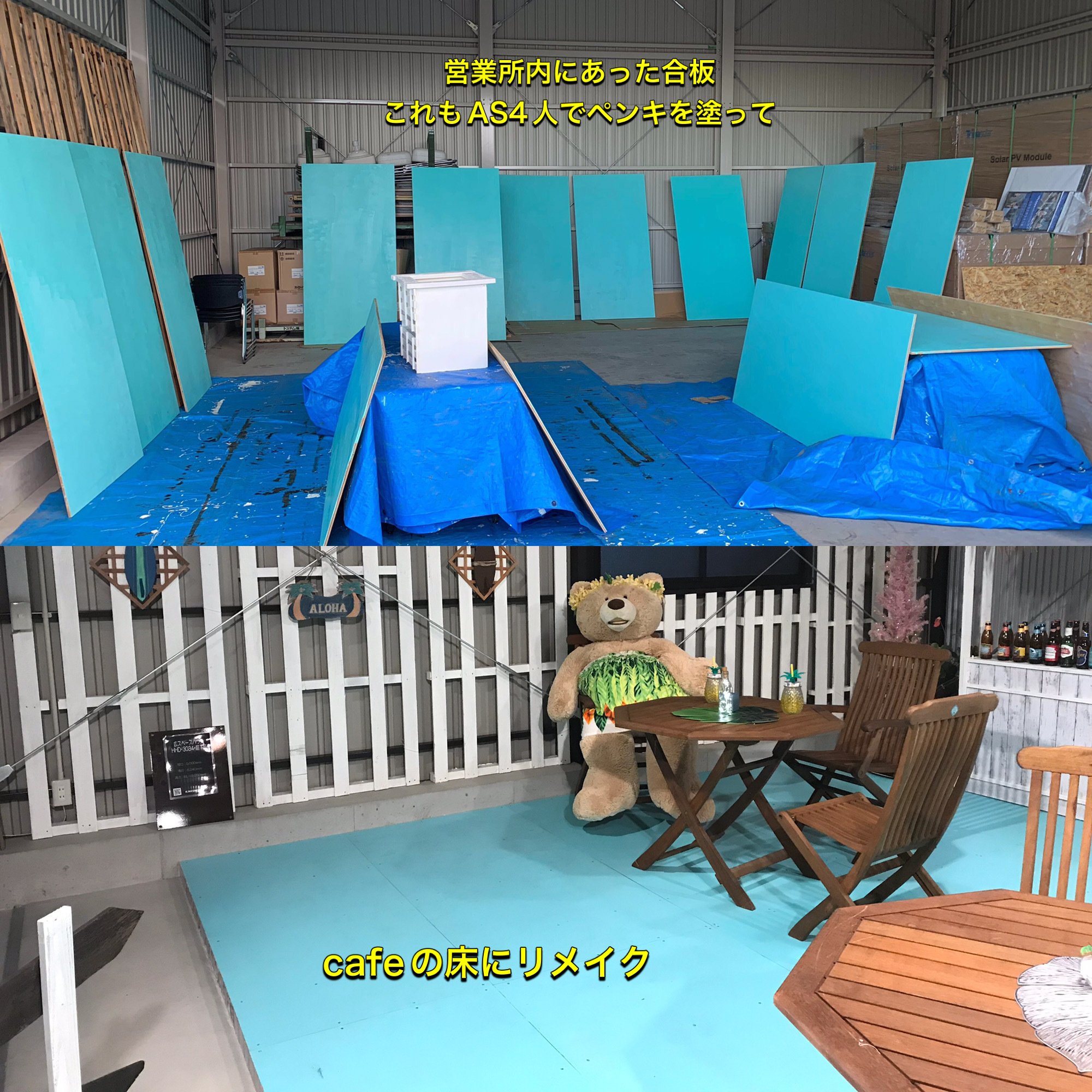 ロコカラーにペンキを塗って、床に貼る!! 冷たいコンクリートの床も一挙に、明るく、南国風に変身です。