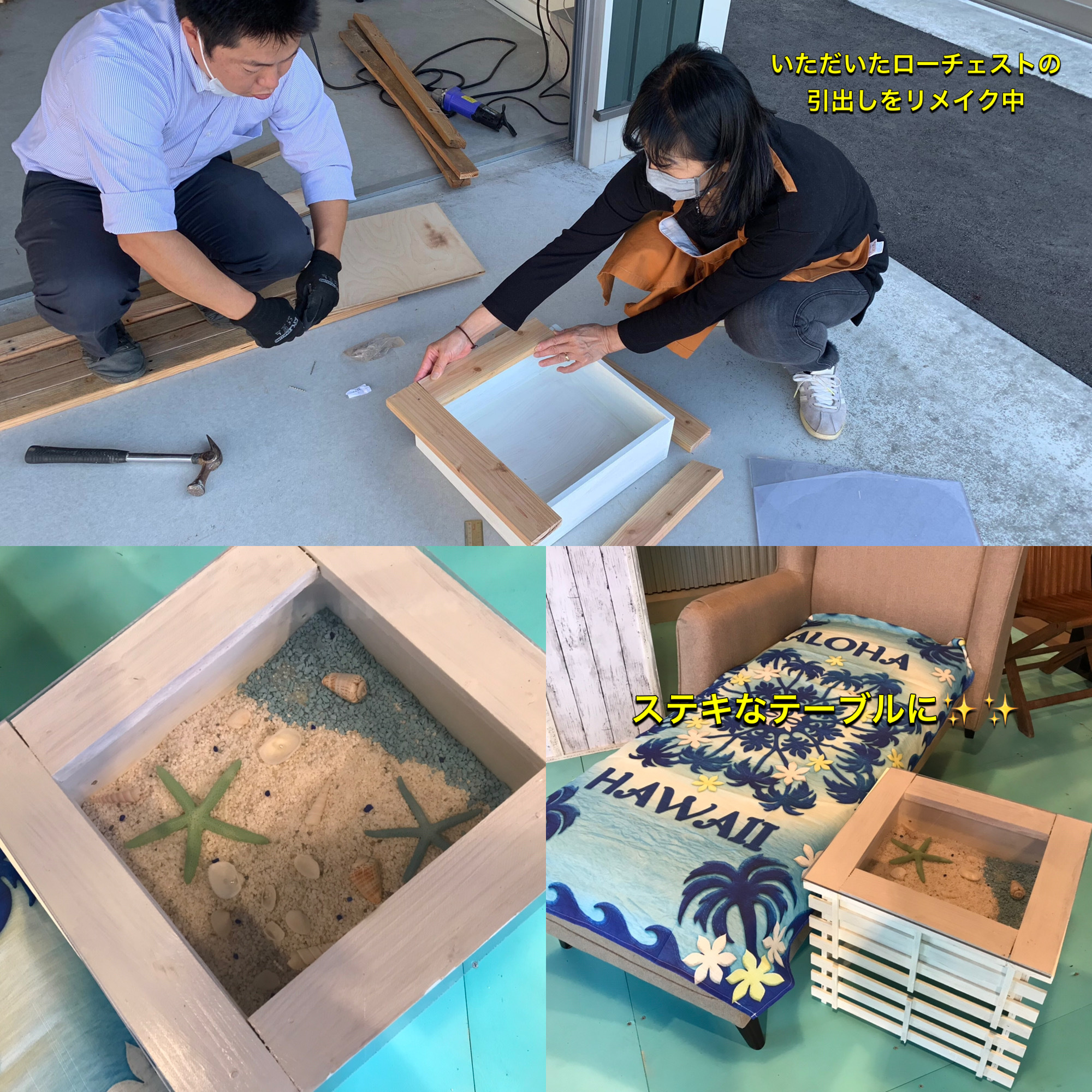 このディスプレイを通して楽しんでもらえたら嬉しいです!!!!! さぁ、始まりました^^ ワクワクしますね💖ローチェストや、廃材をリメイクしているようですね 素敵な、ローテーブルができました!! カッコイイ!!