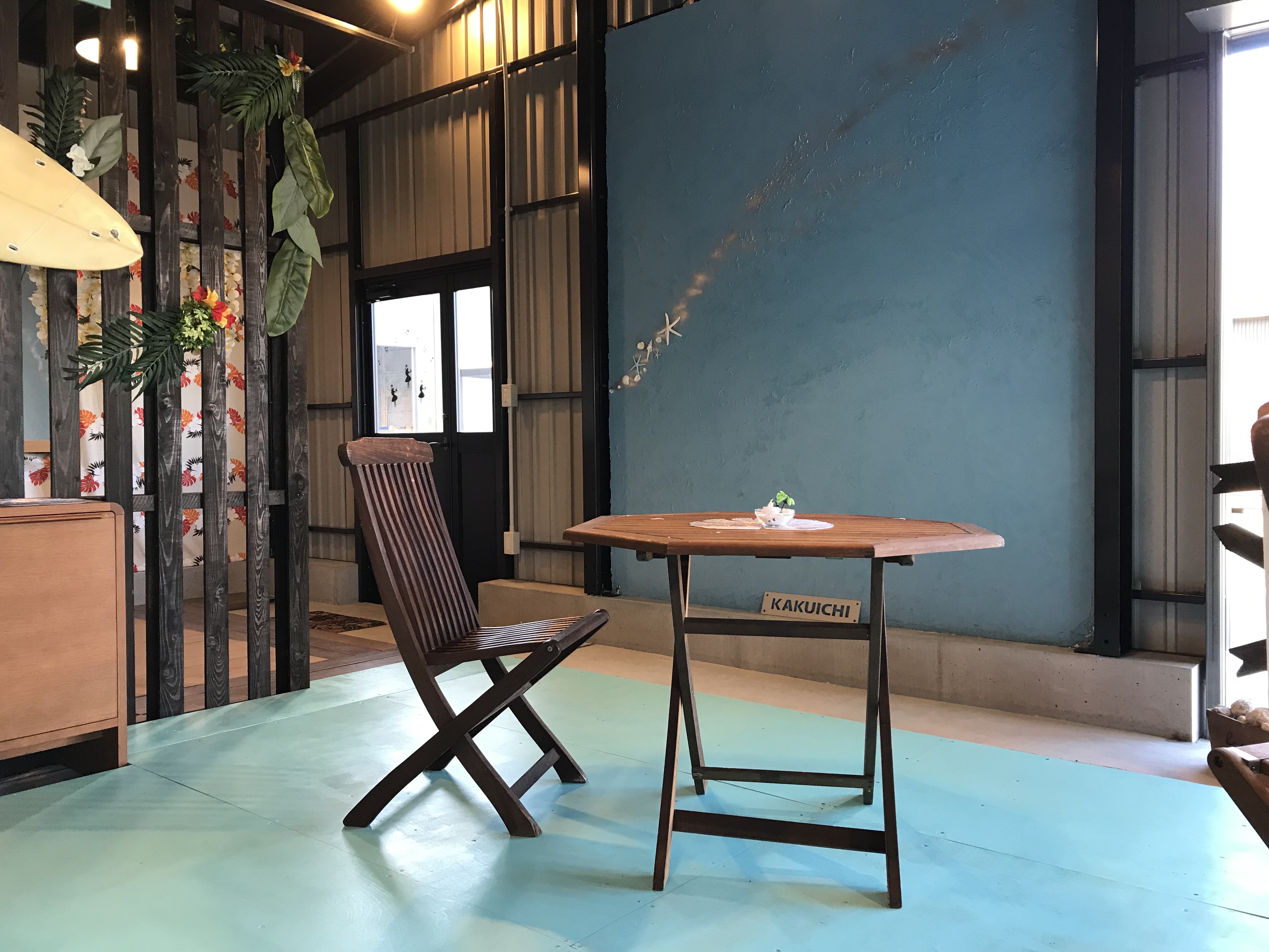A-SITE海老名は湘南地域が活動(営業)エリアでもあり お店のシンボルでもある椰子の木を活かしハワイアンをイメージして 寛げる空間(場所)を表現したい。