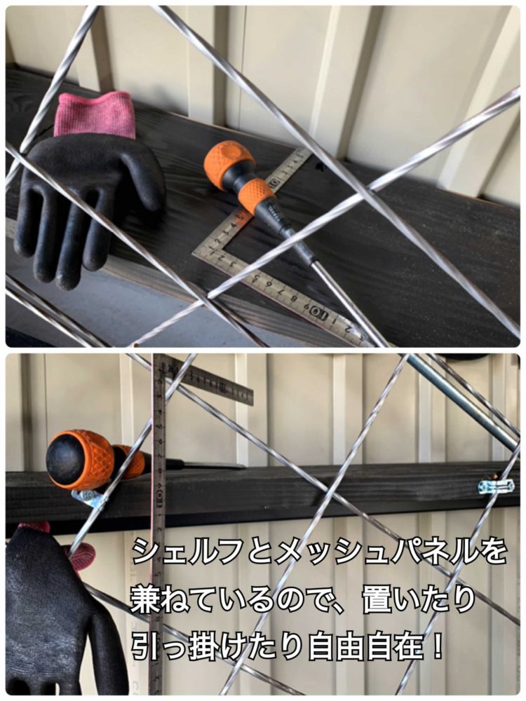棚板とあわせれば、置いたり引っかけたりが自由自在のメッシュラックができるんです♪
