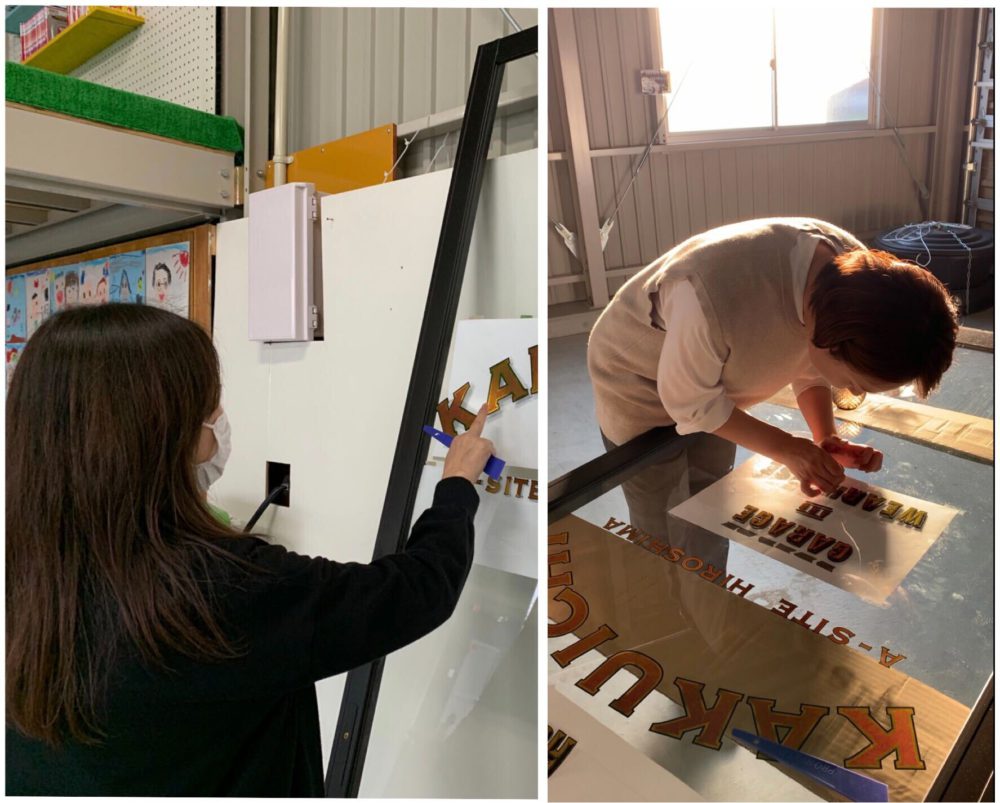 普段事務作業多めの女性陣はステッカー作業に苦戦・・・。