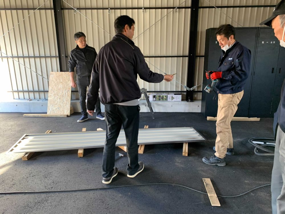 新商品HHDは従来の倉庫とは異なり、ブレースがより室内側についています。そのため、壁面装飾するにはそのブレースがネックに………。それを解消すべく、このように自社で取扱のある折板のタイトフレームを取り付け、実現しました!