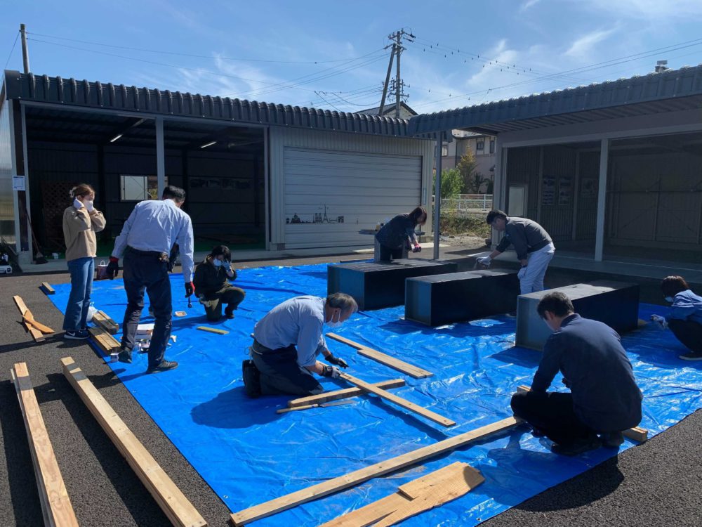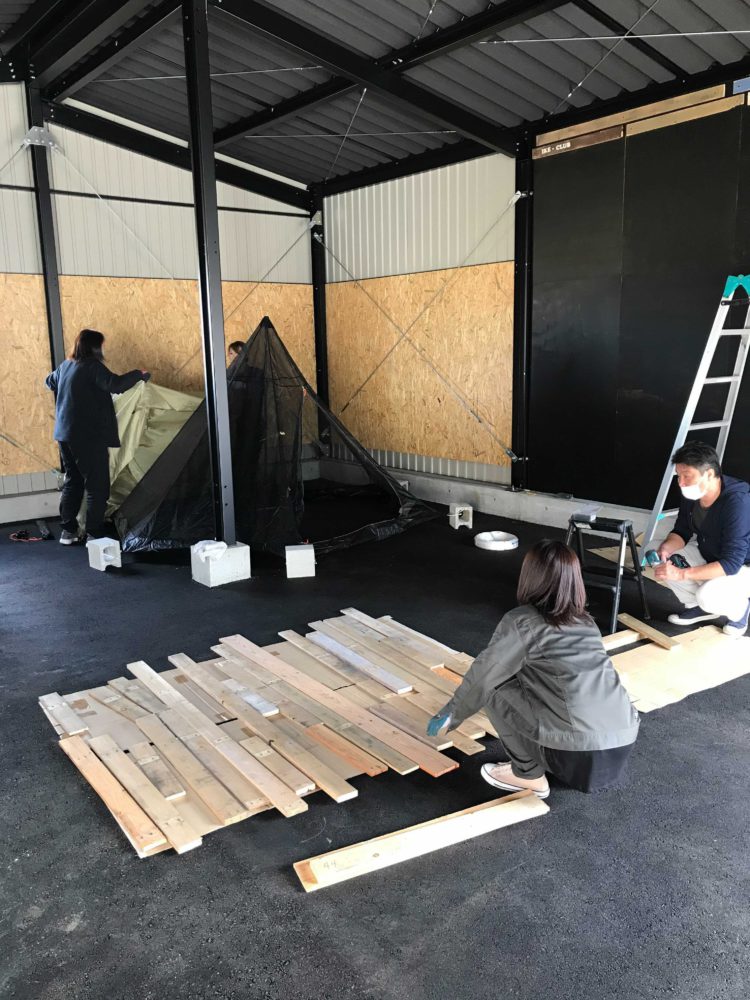 こんな感じで廃パレットを分解し、色を塗ったものをスタッフで貼り付けました♬板と板の間に棚板を挟み込み、棚板の下に支えを入れて、自由自在に移動できます!