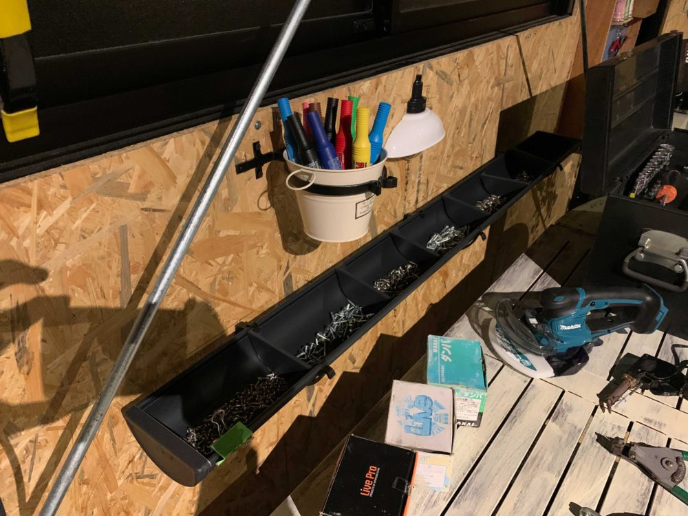 こんな風に雨樋を使用して、ビスなどの細かい物を置けるスペースも!こちらも自社で取り扱っている雨樋です。
