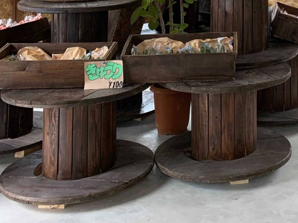 A-SITE新潟のテーマは『地域密着の直売所』。製作時、「予算もないし棚はどうしようか…」と困っていたところ、スタッフから「電線コイルなら安く譲ってもらえるのでは?」という案があり、日頃からお付き合いのある電気業者さんに相談したところ、タダで頂いたそうです。