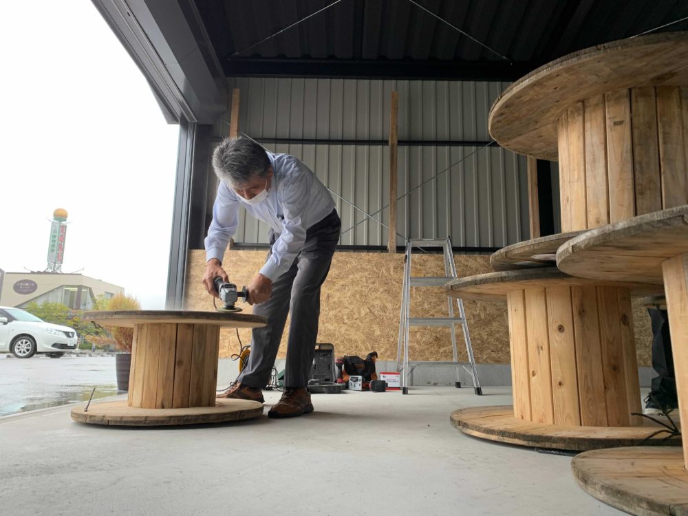 棚として使うために、電線コイルを整える作業が必要。スタッフ総出で通常業務の合間に削る、磨く、の連続。なかなか大変な作業。来る日も来る日も続けました。