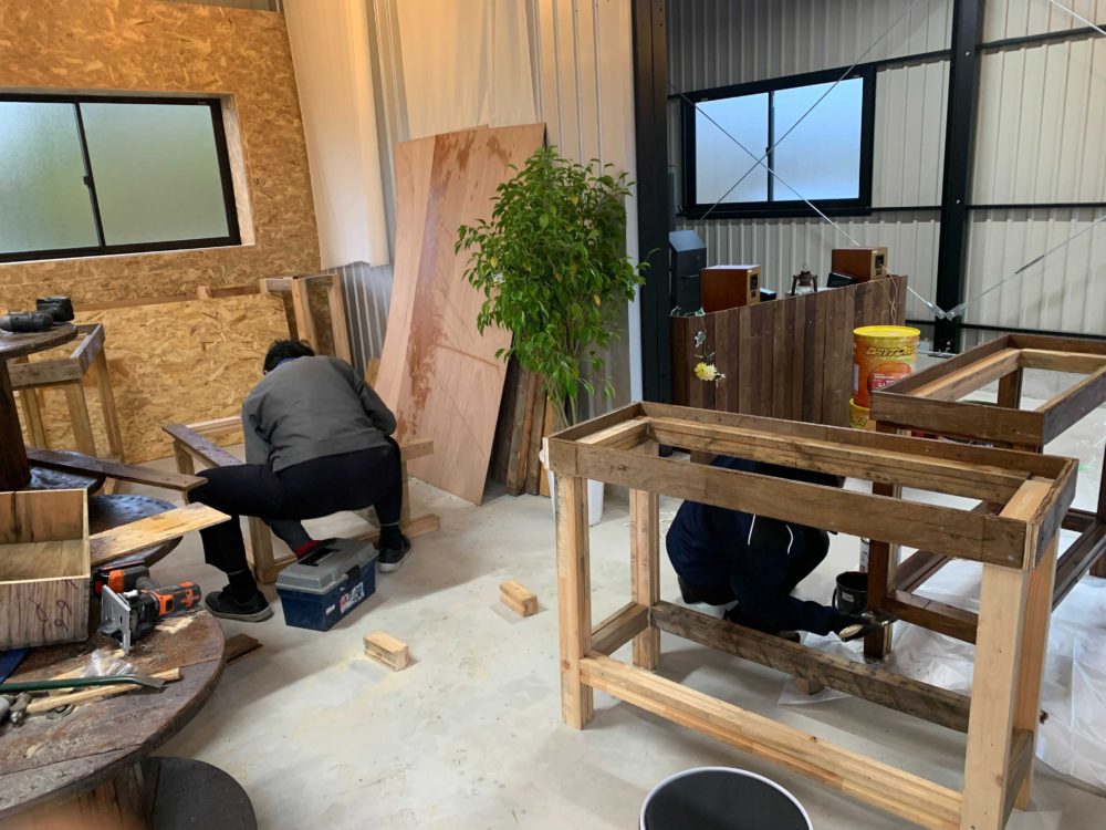 電線コイル以外にも、廃材を使用してカウンターもDIY!