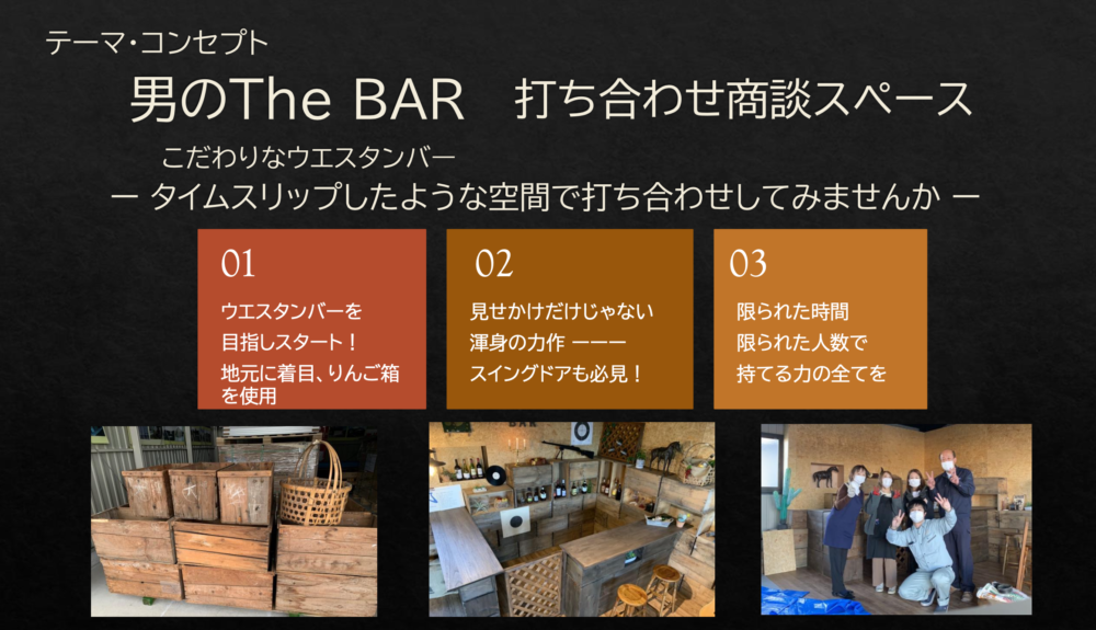 西部劇に出てきそうなウェスタンバーで打合せをしたいとの想いで製作しました。