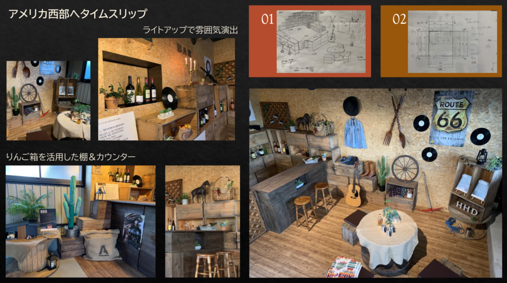 あえてりんご箱の素材を活かす事で、ウェスタン調のレトロな雰囲気も出すことが出来ました。