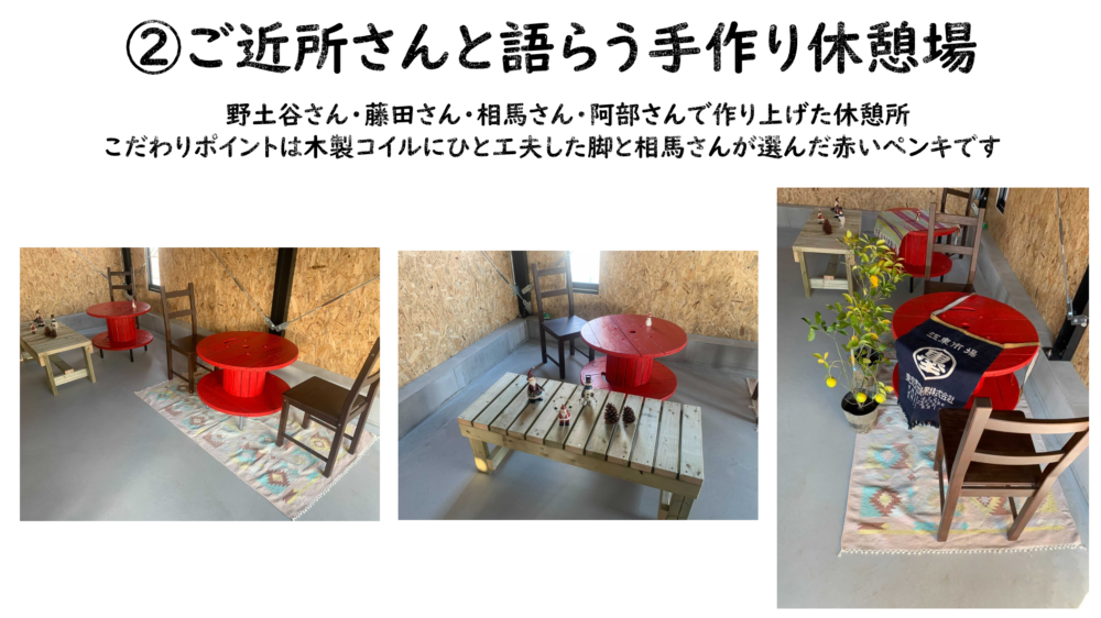 ②ご近所さんと語らう手作り休憩所・・・木製コイルは脚を付けることでグラつき防止