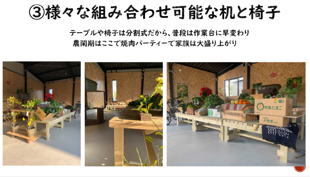 ③様々な組み合わせ可能な机と椅子・・・直売所として使わない時は作業場に早変わり★今回、マルシェと直売所と分かれている意味を考えた時、マルシェ→市場 直売所→農家さんが直接売る場所になるのかな?と考えました。