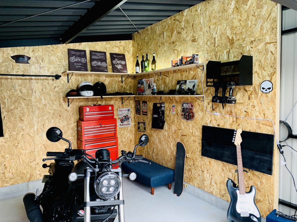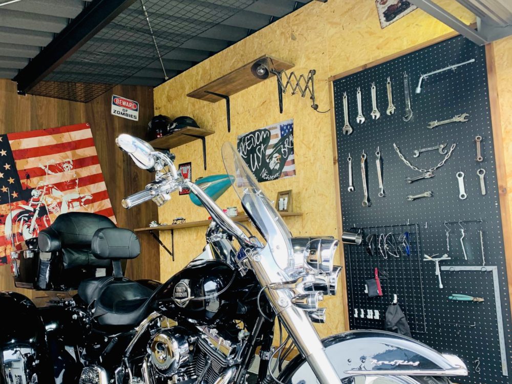 クルマやバイク好きには、自分好みにカスタムできるピットガレージとして最適です。大型バイクも十分なスペースで保管できます。インテリアはアメリカンスタイルにしておしゃれに彩ることも可能。バイク用品や工具はDIYで取り付けた棚に整理整頓しましょう。