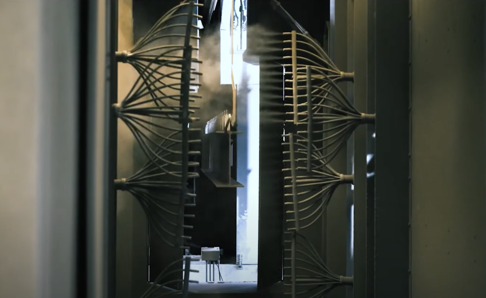 その上から、静電気を使って粉末状の特殊な塗料を付着させています(ポリエステル静電焼付粉体塗装)。