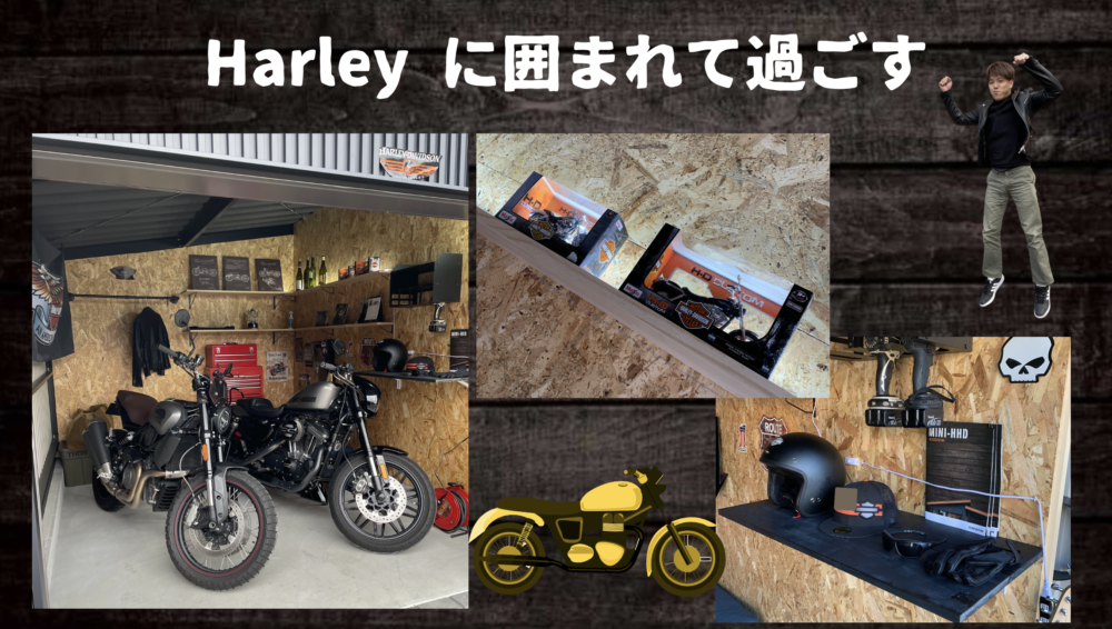 趣味のハーレーグッズを飾り、バイクを眺めながら