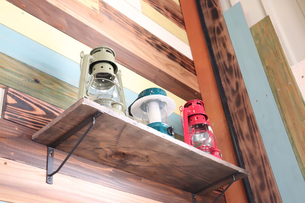 棚とライトを取り付け、好きなアイテムを飾れるようにしています。