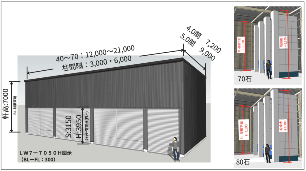 従来の軒高6mでは60石乾燥機までが対応でしたが、7mの販売で70石・80石が対応となります✨