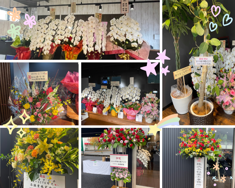 前日から販売店さま・取引先の皆さま・職人さんからの御祝が届きA-SITEの中はとても豪華で綺麗✨お花のあまーい香で溢れています💐