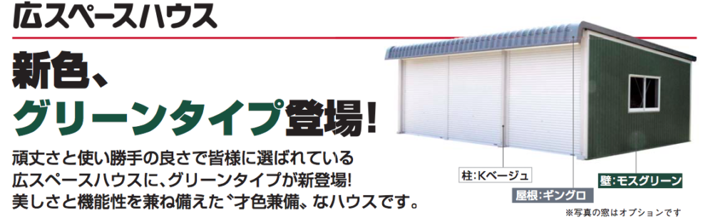 広スペースハウスの色タイプに「グリーンタイプ」が新たに登場しました。