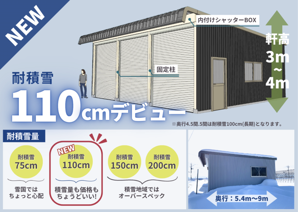 倉庫・車庫『広スペースハウス』の積雪タイプが登場致します。