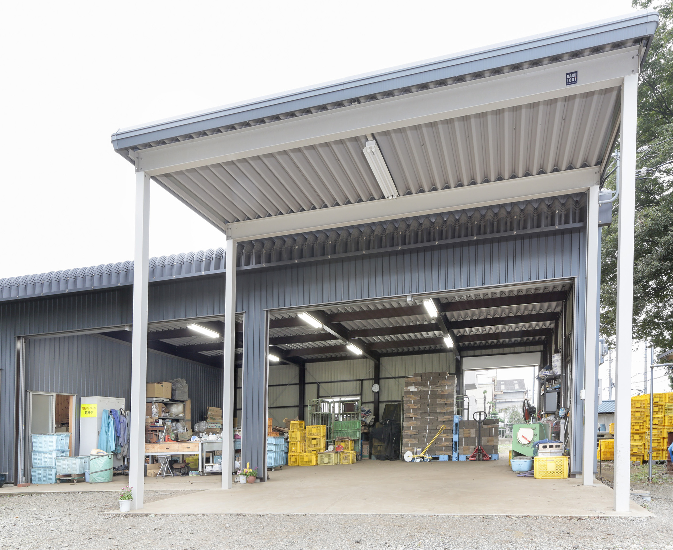 下屋を付けて、後ろの壁にシャッターを付けて開放にしてトラクターの出入りし易い様にし、倉庫の一部を間仕切りして土足で上がれる休憩スペースも作りました。建替えのプランはカクイチのメーカーの営業マンに直接相談に乗って貰ったので安心してお任せできました。