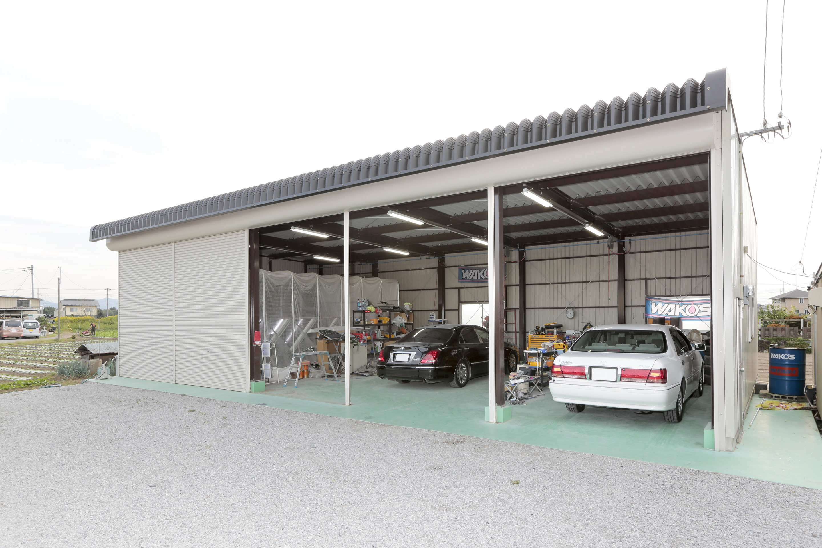 中柱が無いので、広いスペースで作業ができます。大切なお客様の車を扱っているので、丈夫な修理工場を作らなければなりません。