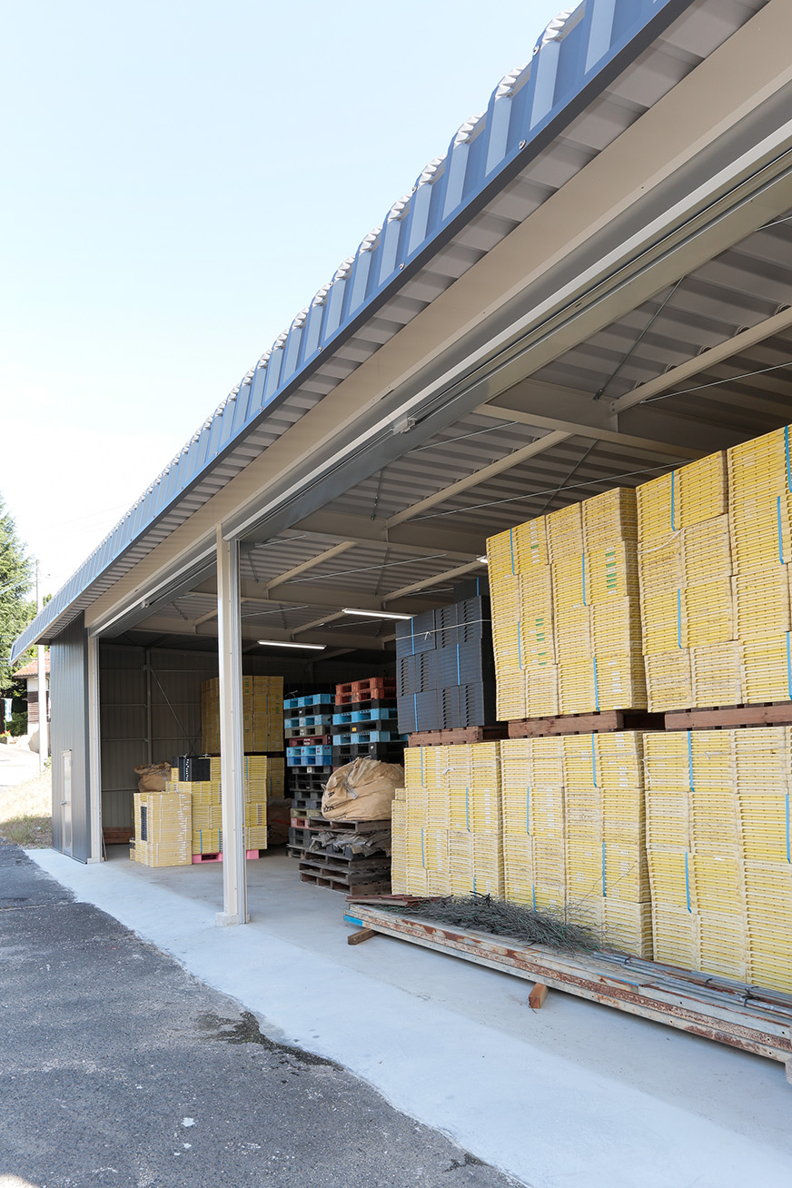 JAさんの倉庫です。 たくさん積んであるのは すべて稲の育苗箱です!
