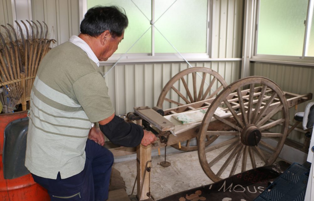 納屋を解体した時に出てきた大八車と米の計量器を記念に保管しています。